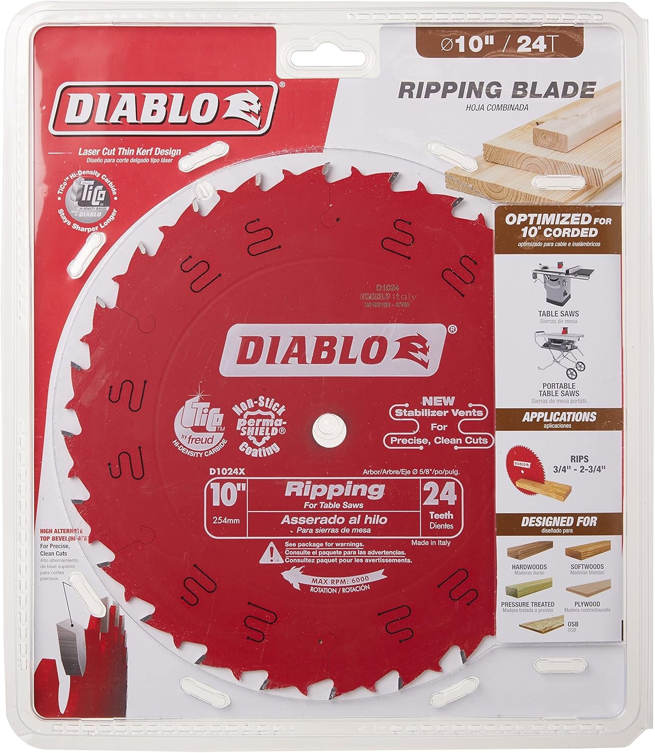 The Diablo Ripping Saw Blade for Wood is engineered for high performance, featuring a TiCo Hi-Density carbide construction for superior, long-lasting rip cuts in wood, plywood, and OSB. With its 24 ATB teeth, ultra-thin laser cut kerf, and Perma-SHIELD non-stick coating, this 10-inch blade delivers fast, clean results while resisting heat, gumming, and corrosion. Its tri-metal shock-resistant brazing and hardened steel body ensure maximum durability—perfect for remodeling and demolition projects. Upgrade your woodworking with the reliability and precision of the Diablo brand.